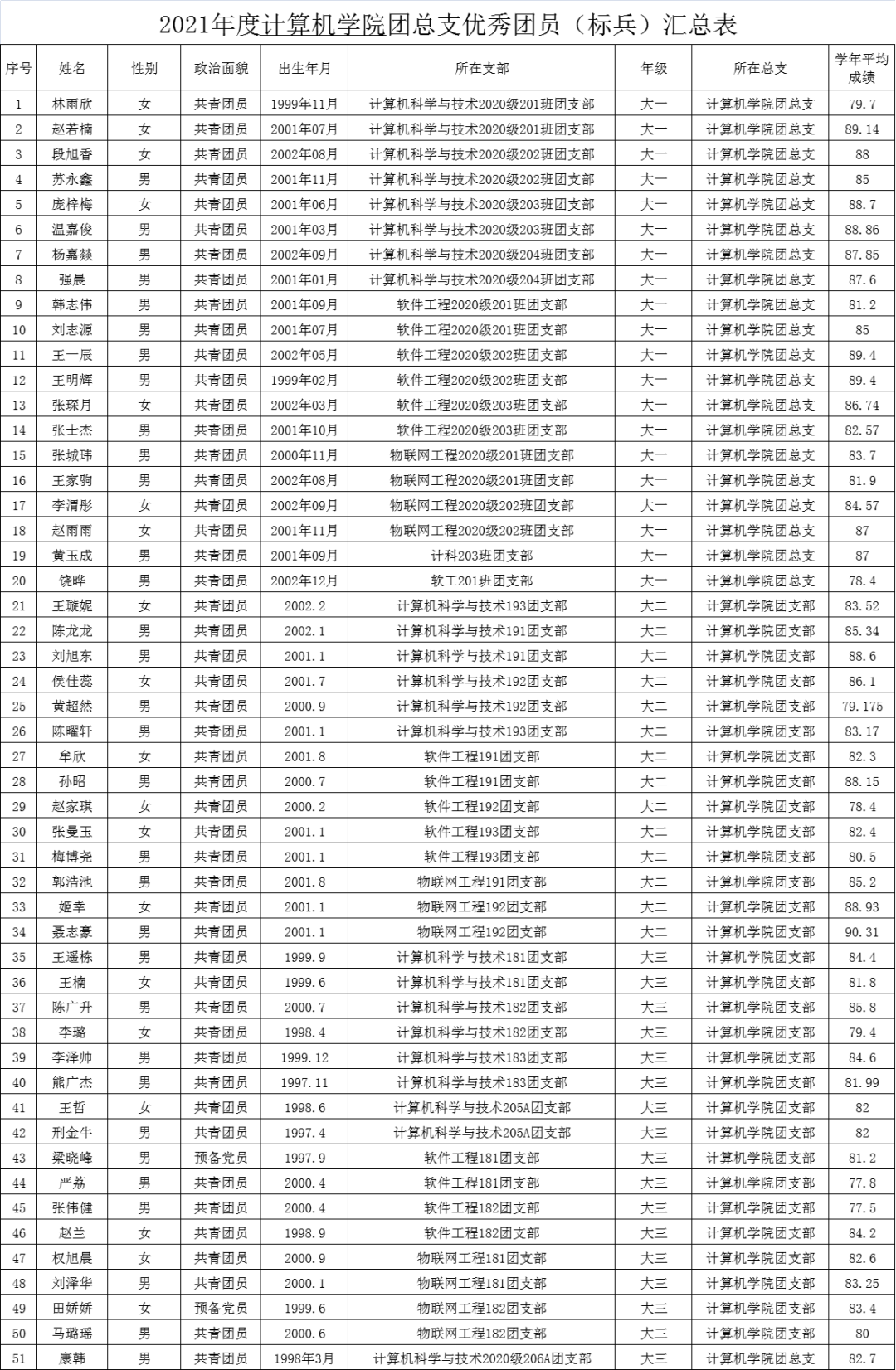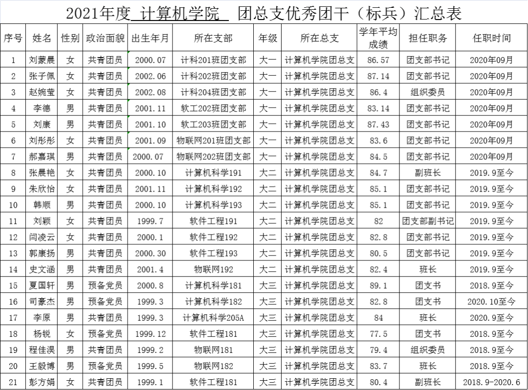 按照校团委《关于开展2021年度qy太阳成集团tyc122ccvip共青团先进集体和优秀个人的评比表彰》文件要求,计算机学院团总支已全部完成评比工作。各班级团支部依据支部投票结果评预推荐对象,公司团总支结合团支部青年大学习、主题团日活动、团员团干日常考核、团支部建设等情况,全面并根据上一学年考试成绩进行最终评定,确定最终推荐对象。现将拟订优秀团员(标兵)、优秀团干(标兵)、优秀团支部和星级志愿者名单进行公示。