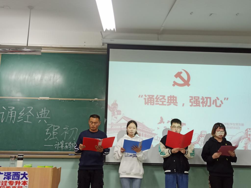 为引导员工党员知史爱国,知史爱党,知史奋进,筑牢红色思想基石、传承四史精神,推动“四史”学习落地落实,3月31日晚,太阳成集团tyc122ccvip员工第一党支部和第二党支部于沣惠校区教学主楼308联合举办“诵经典,强初心”主题演讲比赛,员工第一党支部书记侯勇、员工第二党支部书记王靖晶以及两个支部党员、积极分子参加。