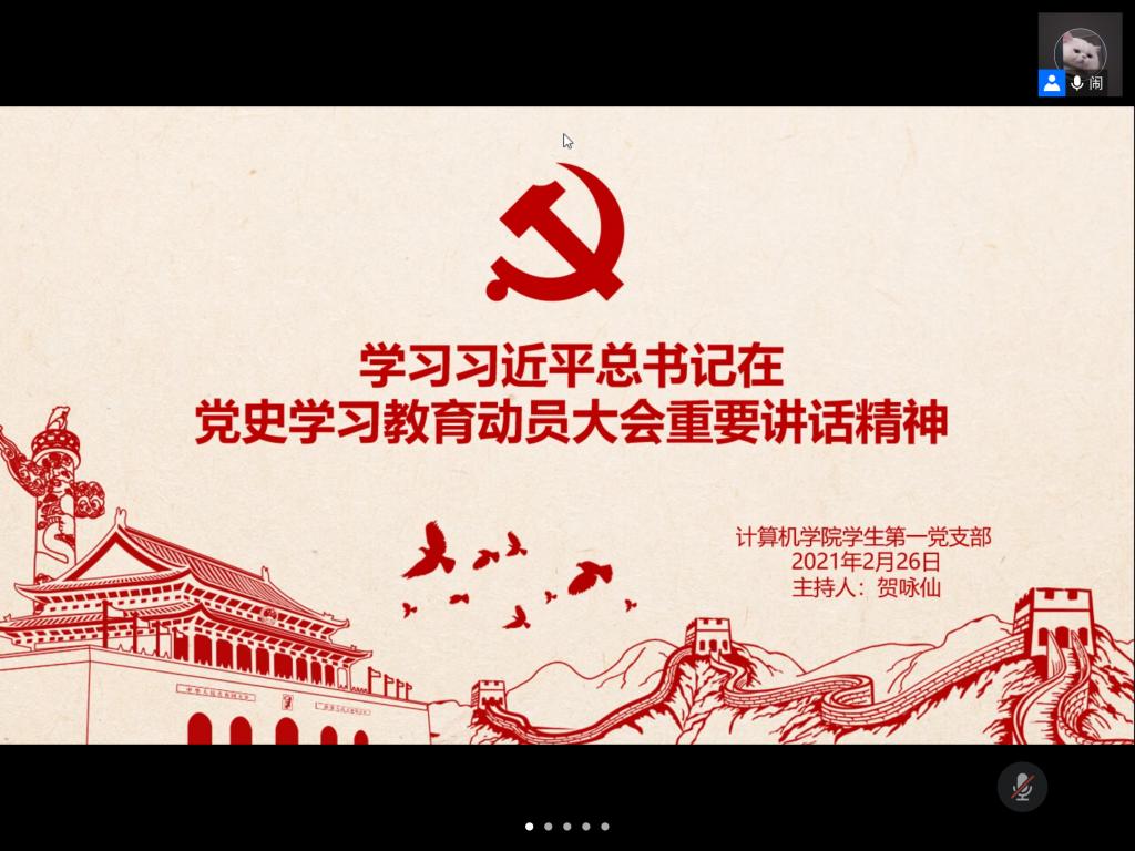 为了更好地学习党史,太阳成集团tyc122ccvip员工第一党支部于2月26日晚上7点在线上开展了学习习近平总书记在党史学习教育动员大会上的重要讲话精神。本次学习由员工第一党支部员工党员贺咏仙主持,员工第一党支部所有党员、预备党员和积极分子参会。