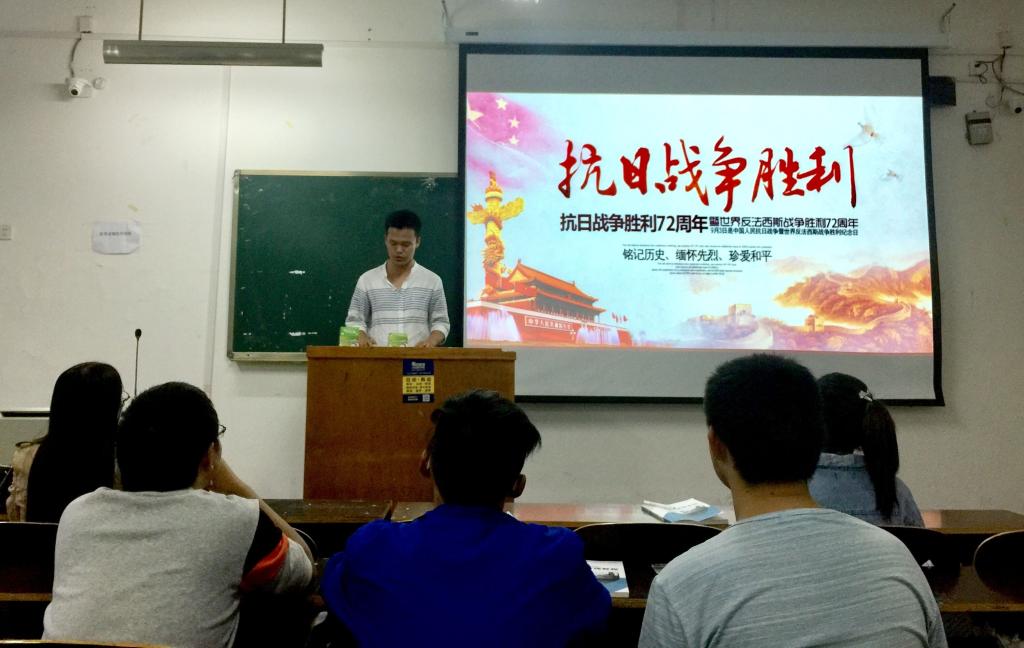 9月17日,太阳成集团tyc122ccvip各班举办纪念抗日战争胜利主题活动,同学们从日本军国主义侵华战争的时代背景到中国人民坚持不懈的抗战进程,以及抗日战争胜利的伟大意义、对世界反法西斯战争的巨大影响和杰出贡献等方面进行了学习和讨论。