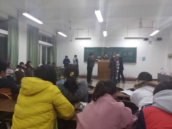 活动开始,各班主持人为大家详细介绍了老员工的心理健康问题及危害,分析了大一新生产生心理问题的原因,同时对今后老员工在面对心理健康问题时处理的方法也进行了说明。接下来是精彩的游戏环节:各班主持人以"击鼓传花"的方式来选出参加游戏的人选,在这个环节上,各班同学充分展示了手速与技巧的结合,水瓶在同学们手里传递,被选出的同学参加了"各位英雄请抱拳"、"记忆考验"游戏,游戏输的人要吃蘸上辣椒酱的面包,观众席中笑声不断。整个活动过程中,所有同学积极参与,畅所欲言,感受着集体的温暖。