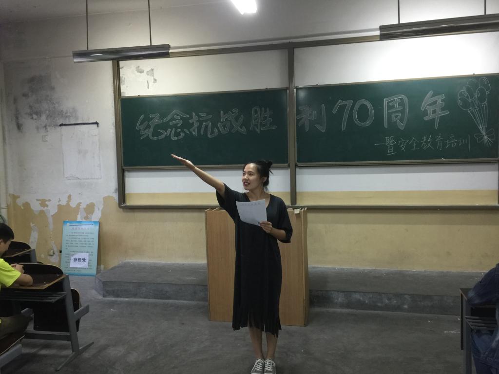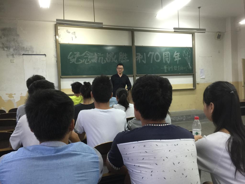 在对抗日战争有了更全面深刻的认识后,各班围绕抗日战争胜利开展合唱、演讲、朗诵、讨论等庆祝活动,从不同的角度表达了对抗日战争胜利70周年的纪念。辅导员米嘉琪老师希望大家珍惜来之不易的和平环境,热爱生活,同时在9·18来临之际做好安全防范工作,严格遵守校规校纪。