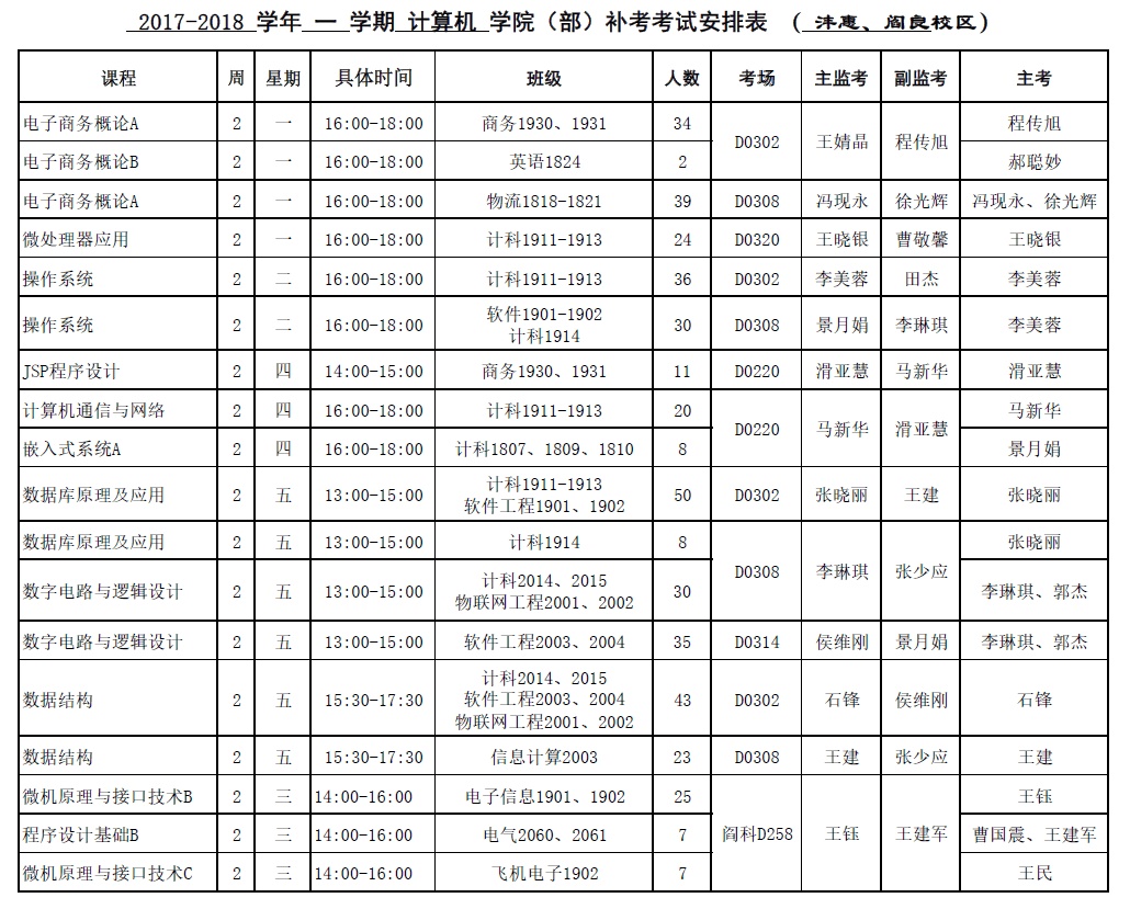 2017-2018-1学期太阳成集团tyc122ccvip课程补考安排