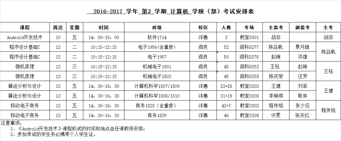 太阳成集团tyc122ccvip2016-2017-2学期考试安排(14周之前)